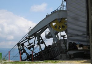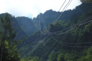 Út közben két oszlop tartja a drótköteleket. Ez azért érdekes, mert miközben a kabin az oszlopok görgőin áthalad, kicsit döcög és utána (főleg lefelé) kissé kileng. Ez nem annyira jó érzés, ilyenkor lehet jó hangosan huhogni, a kezelő biztosan jókat mosolyog magában ezen. 🙂