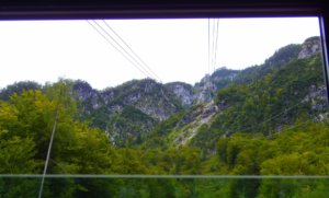 Út közben találkozunk a másik dróton lógó kabinnal, mely hihetetlen sebességgel húz el mellettünk. Oda is, és vissza is. Tehát valószínűleg mi is hihetetlen sebességgel haladunk. 🙂