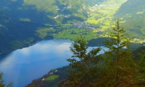 Fantasztikus rálátás nyílik a Bohinji tóra, melynek valami eszméletlen színe van. Aki nem a saját szemével látja, el sem hiszi. A csodás színek oka itt is a mészkő és a napfény. (A fotó ezt nem adja vissza, ezt élőben kell látni.)