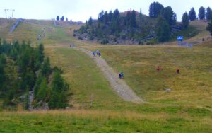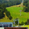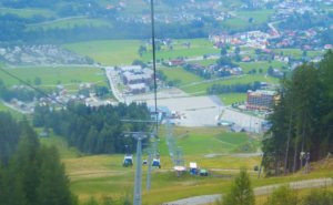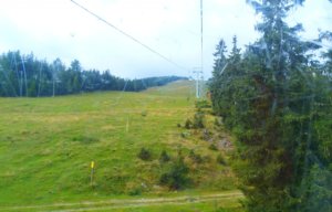 A kabin a fák lombjai mellett, széles lesikló pálya fölött halad. Itt nyáron is magunk elé képzelhetjük, hogyan jönnek lefelé télen a síelők ezen a széles, meredek pályán.