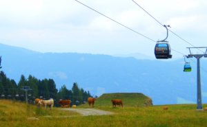 Nyáron legelésző tehenek mellett és fölött haladnak a kabinok.