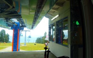 Aztán 1434 méteres magasságban jön a középső állomás, ahol a kabinok újra leakadnak a gyors szállítókötélről, a kabinok ajtaja kinyílik és a lassú araszolás közben lehetőség van ki- vagy beszállásra (de nem muszáj). (Sajnos a kabin ablaka nagyon karcos volt, de azért remélem a lényeg látszik a fotón.)