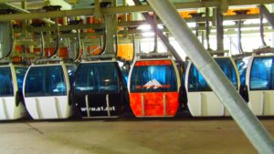 Nagyon-nagyon sok kabin lóg az épületben. Gondolom itt tudják akár megszerelni is őket, ha valami hiba keletkezik. Illetve ezekkel a kabinokkal bővíthető a felvonó kapacitása (főleg télen), vagy csökkenthető a kabinok félreállításával (nyáron).