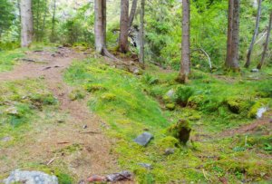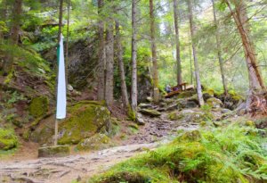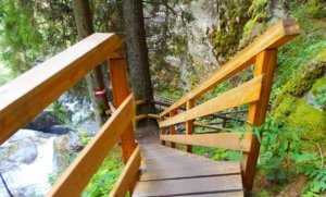 A vízesést mindkét oldalról sötét és misztikusnak ható fenyőerdő veszi körül. És nem kell sokat menni, hogy elérjük a kiépített fahidakat és lépcsőket.