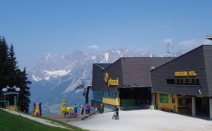 A felső állomás mellett közvetlenül játszótér várja a gyerekeket. A kilátás pedig a havas tetejű Dachstein masszívumra tényleg lélegzetelállító.