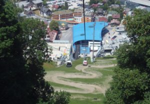 Felülről a középső állomás épülete szépen belesimul a tájba. Ha nem szálltuk ki, akkor egy kis lassabb döcögés után ismét záródnak az ajtók, majd a gyors szállítókötélen repülünk tovább.