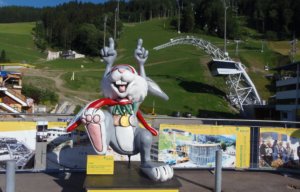Lent, a felvonó mellett pedig Hopsi (a sívilágbajnokság nyula) várja a célba érőket.