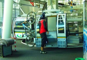 Felfelé felakasztják a bringát a kabinra és kényelmesen fellibegnek, aztán 1830 méter magasan már csak egy irány van: lefelé. Száguldanak, mint a szél. Csak a fékek bírják! 🙂