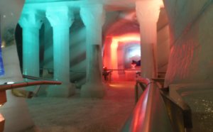 A függőhídon és az acélszerkezetes úton keresztül juthatunk a Dachstein Eispalast-ba. (Aki arra nem vállalja, az bemehet a másik végén lévő, kék-sárga kijáraton is. Ez látszik a fotón.) Az Eispalast a gleccser jegébe 6 méter mélyen futó, vésett és faragott barlangrendszer, mely csodálatos, misztikus, jégből és hóból álló világot rejt mélyen a gleccser jege alatt. A jégszobrokat minden évben újra faragják, így minden évben más szobrokat láthatunk.