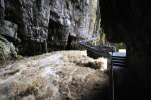 Mi is az a szurdokvölgy? A szurdok általában egy mély völgyben futó sebes folyó, patak. Évezredek alatt vájt a mészkőbe a víz mély völgyet, és munkálkodik ezen tovább a mai napig. Ez a folyó a Skocjan barlangban a Reka, ami hóolvadáskor, nagy esőzésekkor megduzzadva hömpölyög és dübörög át a barlangon, máskor meg éppen csak folydogál valahol a mélyben. Itt éppen jó magas a vízállás – főleg a következő képhez képest.