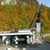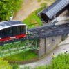 Az alsó állomás szépen megbújik a régi épületek között. Modern, mégis diszkrét, a sok üveg miatt szinte átlátszó és belesimul a környezetébe. De a hegyre vezető sínpár elárulja.