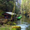 Itt indul a faúsztatók útja – vagy az úszó farönkök útja, ahol nagyon látványos és bonyolult fahidakat és építményeket nézhetünk meg. Persze nyilván még nagyobb élmény, amikor a rönkök jönnek lefelé a folyón, tehát működés közben láthatjuk ezt az egész rendszert, de azért máskor érkezve is nagyon látványos és gyönyörű az egész völgy.